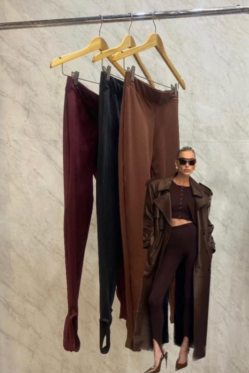 Calça legging, de cós alto e com o detalhe de pezinho na barra, para assegurar a peça e que também serve de detalhe.