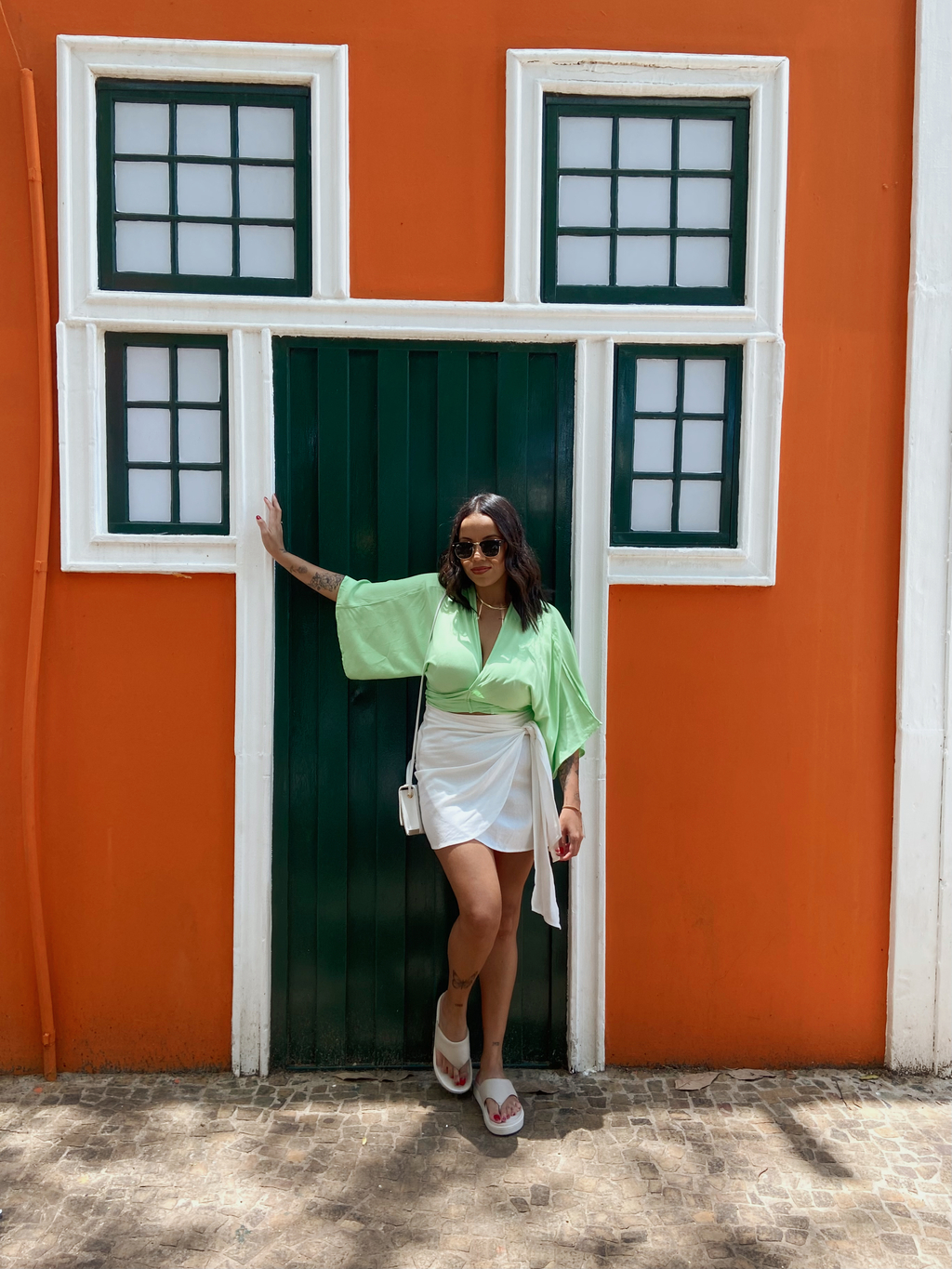 Confeccionado em tecido de composição viscolinho, o Cropped Felícia Amarração combina a suavidade do visco e a leveza do linho, garantindo um toque agradável à pele e um caimento impecável. O decote V no busto realça a silhueta de forma elegante, enquanto as mangas curtas soltas com design sino adicionam um charme especial e um toque boho ao visual.