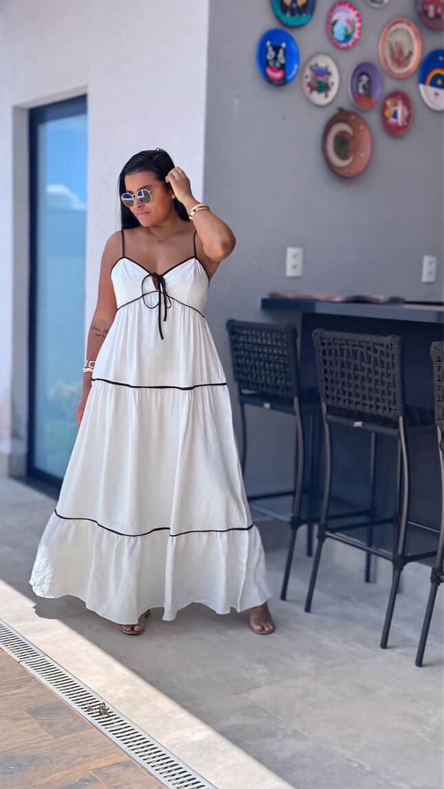 Detalhes Encantadores: O vestido conta com alças que possuem regulagem, permitindo um ajuste personalizado. Além disso, a amarração nas costas e na frente adiciona um toque especial e único à peça, valorizando ainda mais sua silhueta.